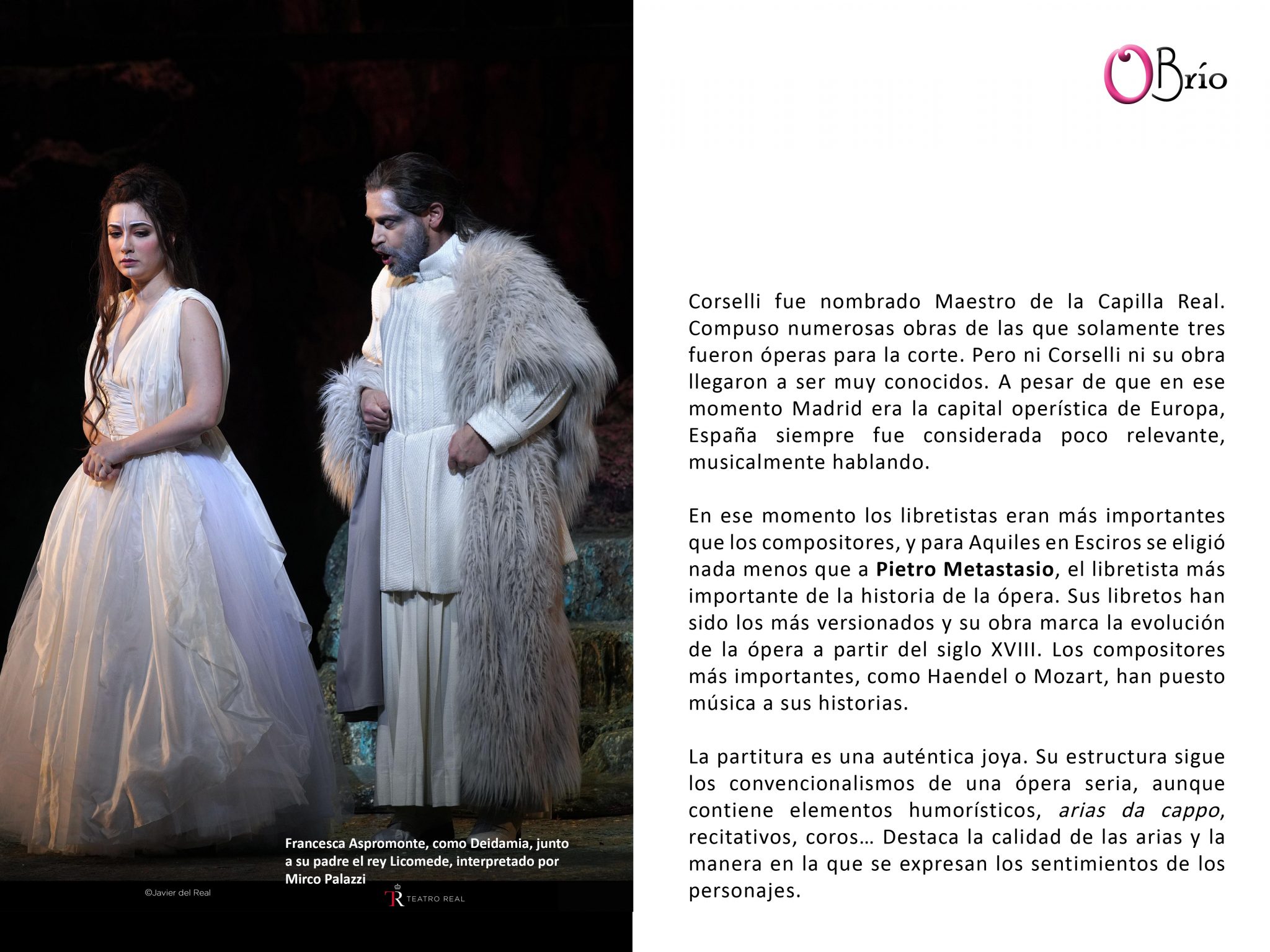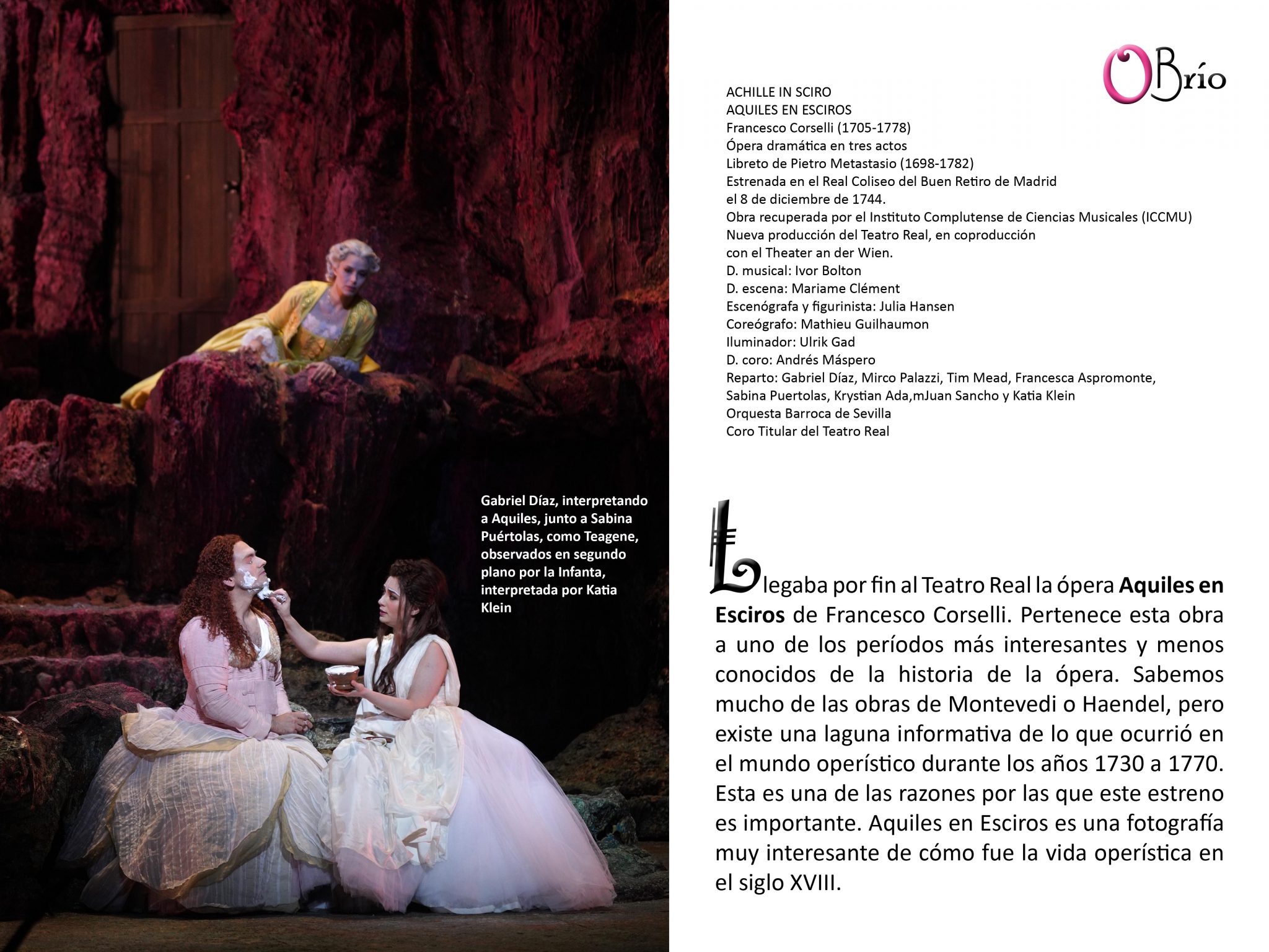 Llegaba por fin al Teatro Real la ópera Aquiles en Esciros de Francesco Corselli. Pertenece esta obra a uno de los períodos más interesantes y menos conocidos de la historia de la ópera. Sabemos mucho de las obras de Montevedi o Haendel, pero existe una laguna informativa de lo que ocurrió en el mundo operístico durante los años 1730 a 1770. Esta es una de las razones por las que este estreno es importante. Aquiles en Esciros es una fotografía muy interesante de cómo fue la vida operística en el siglo XVIII.