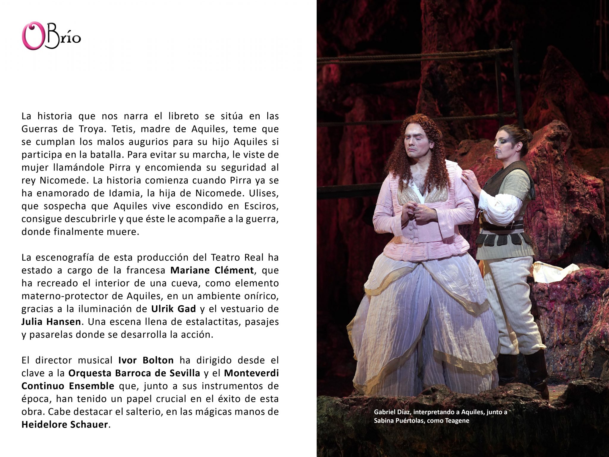 Los personajes de Aquiles y Pirra han estado interpretados por el contratenor Gabriel Díaz, sustituyendo a un enfermo Franco Fagioli. El sevillano ha resuelto con soltura y brillantez unos roles nada fáciles, tiene nada menos que siete arias, algunas de bellísima factura, como Tornate sereni. Aunque la tesitura escrita es más aguda que la de su instrumento, ha defendido con bravura su doble personaje. Muy bien en los recitativos.