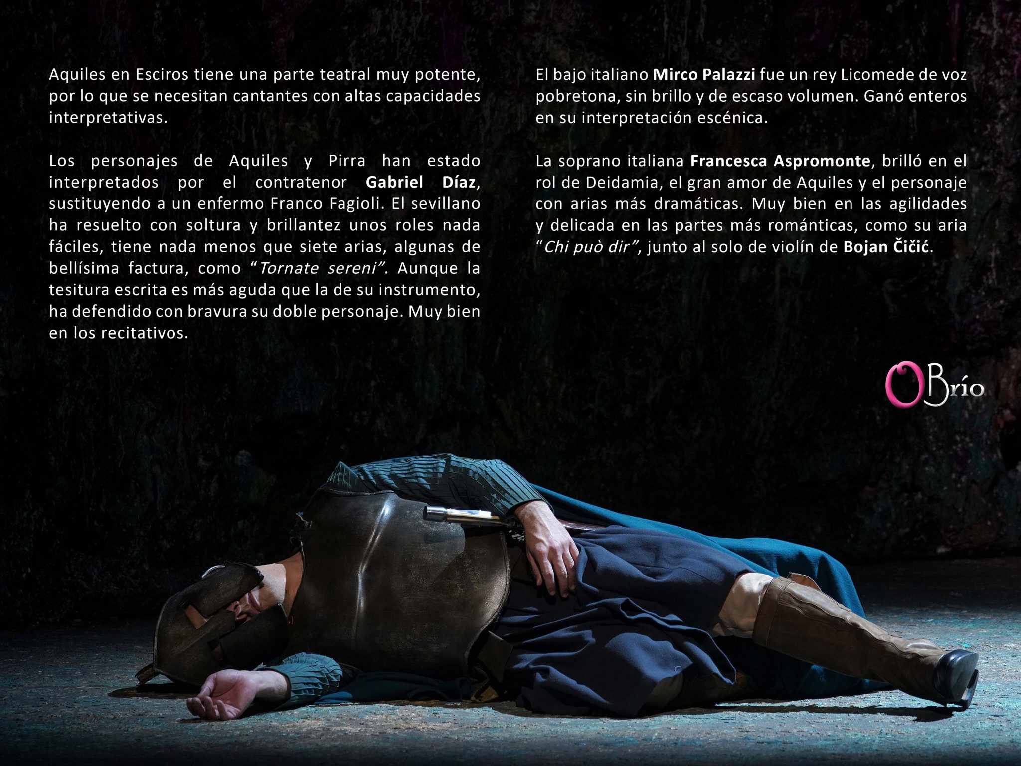 La soprano italiana Francesca Aspromonte, brilló en el rol de Deidamia, el gran amor de Aquiles y el personaje con arias más dramáticas. Muy bien en las agilidades y delicada en las partes más románticas, como su aria Chi può dir, junto al solo de violín de Bojan Čičić.