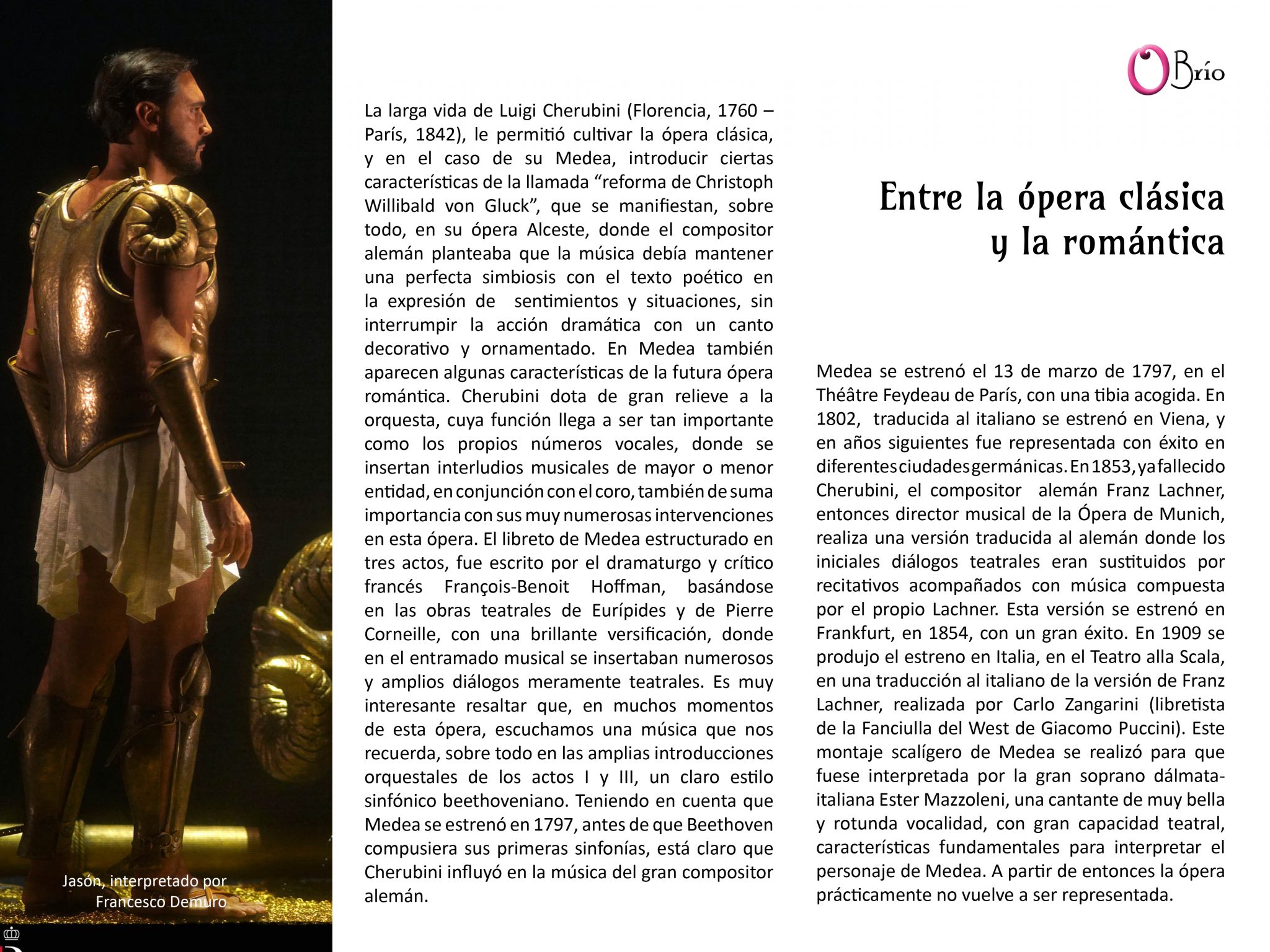 La larga vida de Luigi Cherubini (Florencia, 1760 – París, 1842), le permitió cultivar la ópera clásica, y en el caso de su Medea, introducir ciertas características de la llamada “reforma de Christoph Willibald von Gluck”, que se manifiestan, sobre todo, en su ópera Alceste, donde el compositor alemán planteaba que la música debía mantener una perfecta simbiosis con el texto poético en la expresión de sentimientos y situaciones, sin interrumpir la acción dramática con un canto decorativo y ornamentado. En Medea también aparecen características de la futura ópera romántica. Cherubini dota de gran relieve a la orquesta, cuya función llega a ser tan importante como los propios números vocales, donde se insertan interludios musicales de mayor o menor entidad, en conjunción con el coro, también de suma importancia con sus muy numerosas intervenciones en esta ópera. El libreto de Medea estructurado en tres actos, fue escrito por el dramaturgo y crítico francés François-Benoit Hoffman, basándose en las obras teatrales de Eurípides y de Pierre Corneille, con una brillante versificación, donde en el entramado musical se insertaban numerosos y amplios diálogos meramente teatrales. Es muy interesante resaltar que, en muchos momentos de esta ópera, escuchamos una música que nos recuerda, sobre todo en las amplias introducciones orquestales de los actos I y III, un claro estilo sinfónico beethoveniano. Teniendo en cuenta que Medea se estrenó en 1797, antes de que Beethoven compusiera sus primeras sinfonías, está claro que Cherubini influyó en la música del gran compositor alemán.