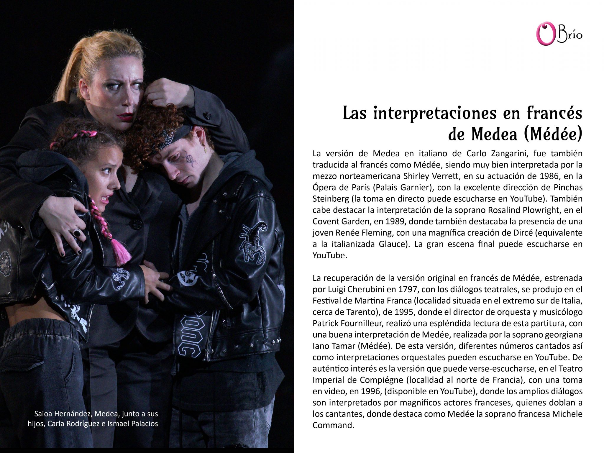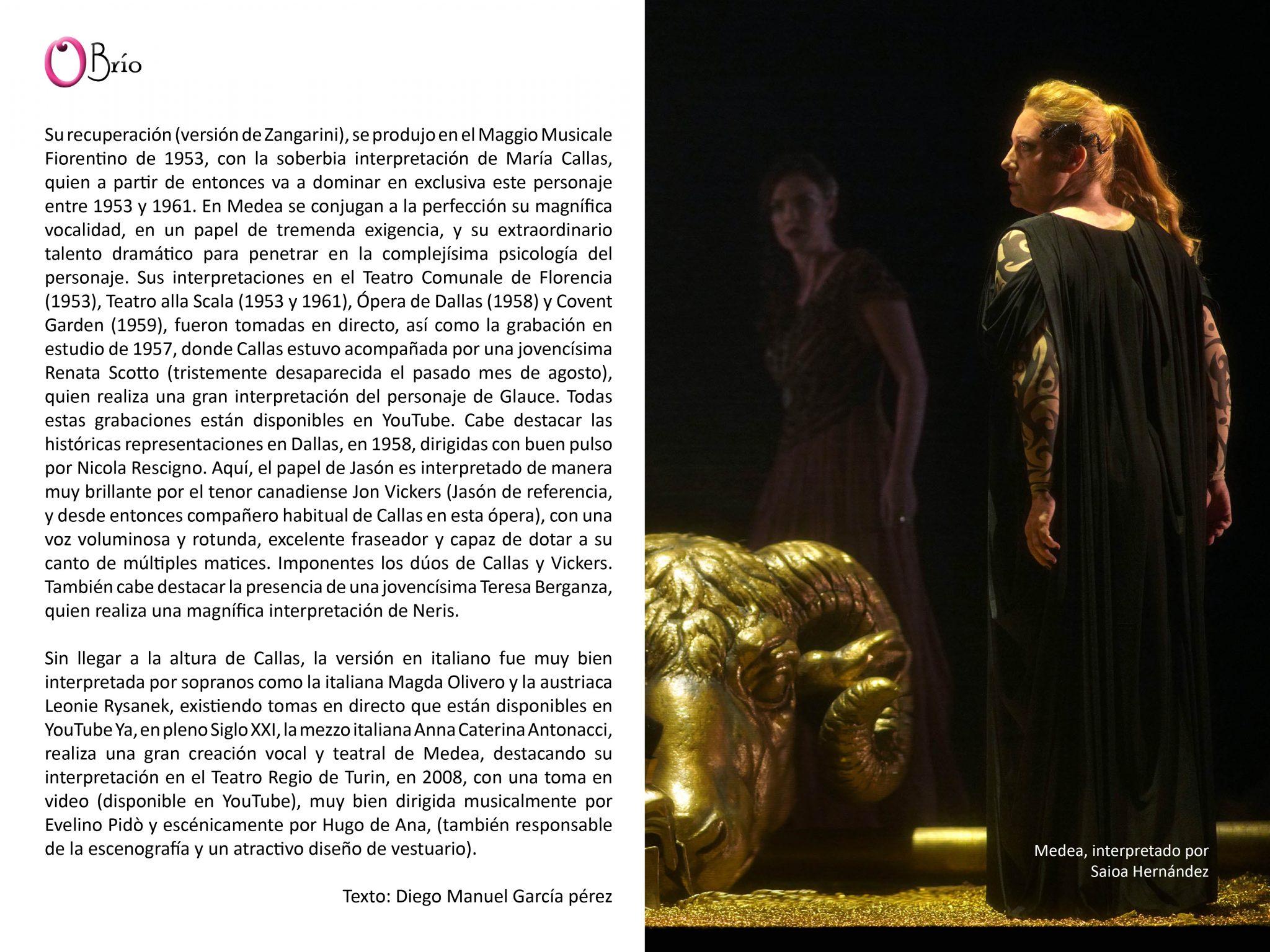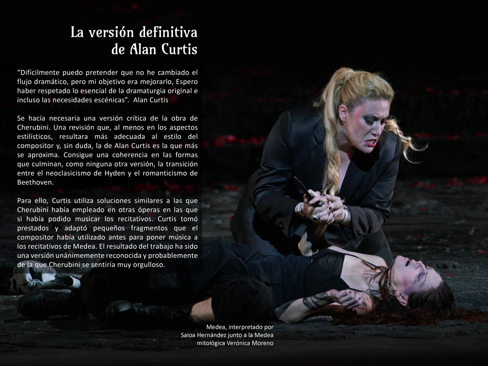 La partitura de Medea está considerada una de las más grandes composiciones de la historia de la ópera. Mario Muñoz comenta en el programa de mano que “El tratamiento orquestal es muy refinado, más denso que el de sus contemporáneos, y la ambigüedad del personaje principal se refleja en su vocalidad compleja, que requiere de una actriz trágica que sepa cantar antes que, al contrario. Medea es tormenta y tormento a partes iguales, lo que anuncia la materia de los que estarán hechos los dramas durante todo el siglo XIX”.