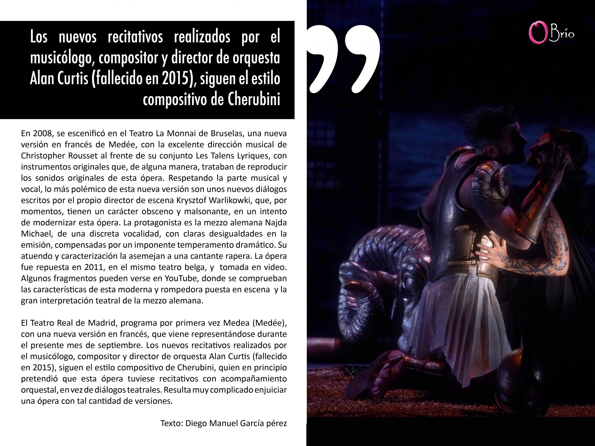 El Teatro Real de Madrid, programa por primera vez Medea (Medée), con una nueva versión en francés, que viene representándose durante el presente mes de septiembre. Los nuevos recitativos realizados por el musicólogo, compositor y director de orquesta Alan Curtis (fallecido en 2015), siguen el estilo compositivo de Cherubini, quien en principio pretendió que esta ópera tuviese recitativos con acompañamiento orquestal, en vez de diálogos teatrales. Resulta muy complicado enjuiciar una ópera con tal cantidad de versiones.