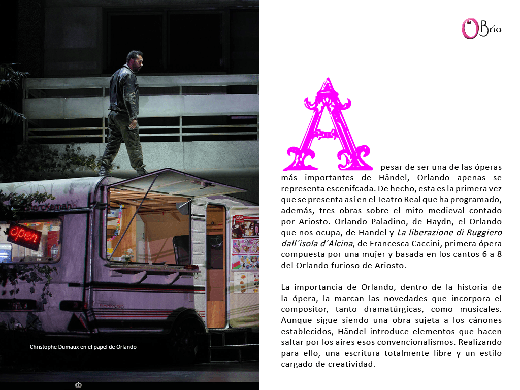 A pesar de ser una de las óperas más importantes de Händel, Orlando apenas se representa escenifcada. De hecho, esta es la primera vez que se presenta así en el Teatro Real que ha programado, además, tres obras sobre el mito medieval contado por Ariosto. Orlando Paladino, de Haydn, el Orlando que nos ocupa, de Handel y La liberazione di Ruggiero dall´isola d´Alcina, de Francesca Caccini, primera ópera compuesta por una mujer y basada en los cantos 6 a 8 del Orlando furioso de Ariosto.