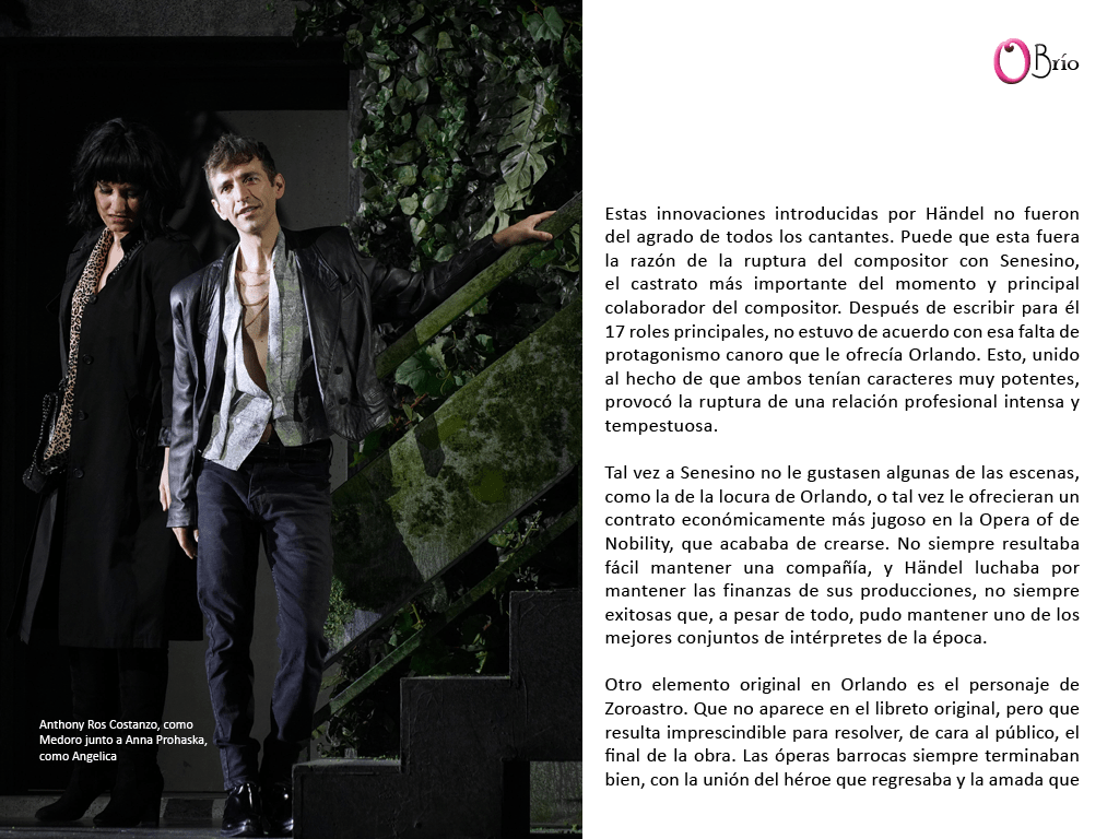 Estas innovaciones introducidas por Händel no fueron del agrado de todos los cantantes. Puede que esta fuera la razón de la ruptura del compositor con Senesino, el castrato más importante del momento y principal colaborador del compositor. Después de escribir para él 17 roles principales, no estuvo de acuerdo con esa falta de protagonismo canoro que le ofrecía Orlando. Esto, unido al hecho de que ambos tenían caracteres muy potentes, provocó la ruptura de una relación profesional intensa y tempestuosa.