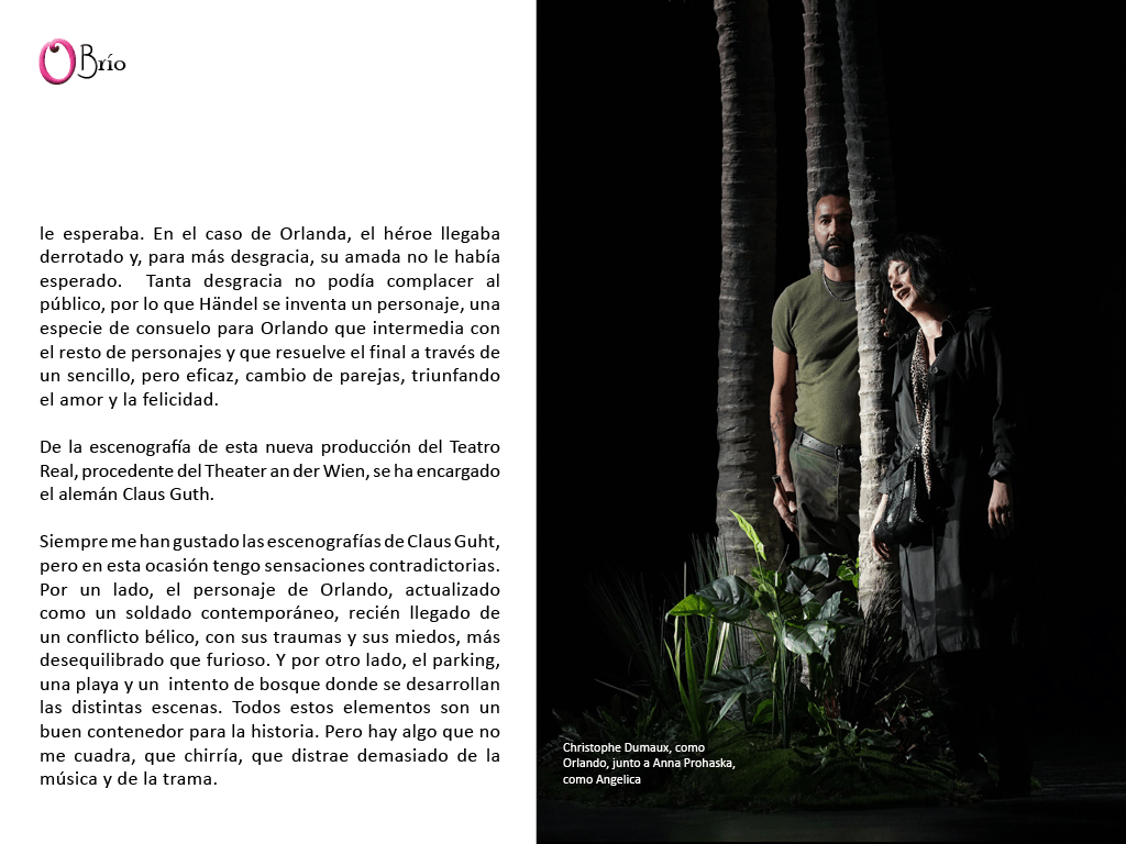 Siempre me han gustado las escenografías de Claus Guht, pero en esta ocasión tengo sensaciones contradictorias. Por un lado, el personaje de Orlando, actualizado como un soldado contemporáneo, recién llegado de un conflicto bélico, con sus traumas y sus miedos, más desequilibrado que furioso. Y por otro lado, el parking, una playa y un intento de bosque donde se desarrollan las distintas escenas. Todos estos elementos son un buen contenedor para la historia. Pero hay algo que no me cuadra, que chirría, que distrae demasiado de la música y de la trama.