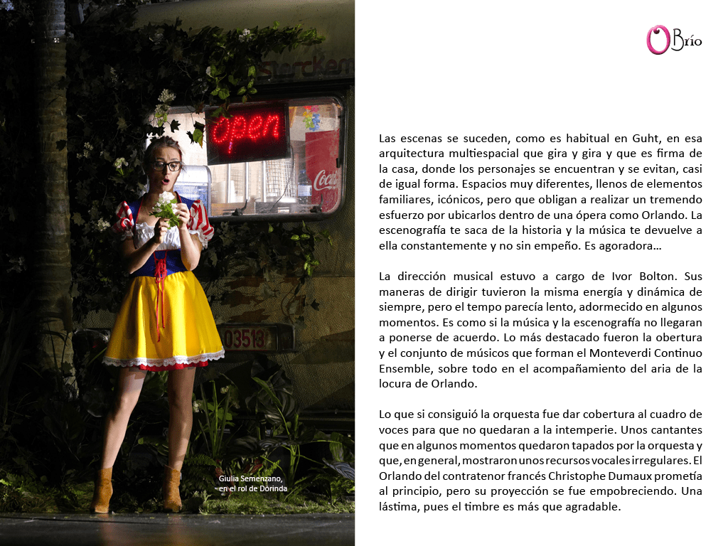 Las escenas se suceden, como es habitual en Guht, en esa arquitectura multiespacial que gira y gira y que es firma de la casa, donde los personajes se encuentran y se evitan, casi de igual forma. Espacios muy diferentes, llenos de elementos familiares, icónicos, pero que obligan a realizar un tremendo esfuerzo por ubicarlos dentro de una ópera como Orlando. La escenografía te saca de la historia y la música te devuelve a ella constantemente y no sin empeño. Es agoradora…