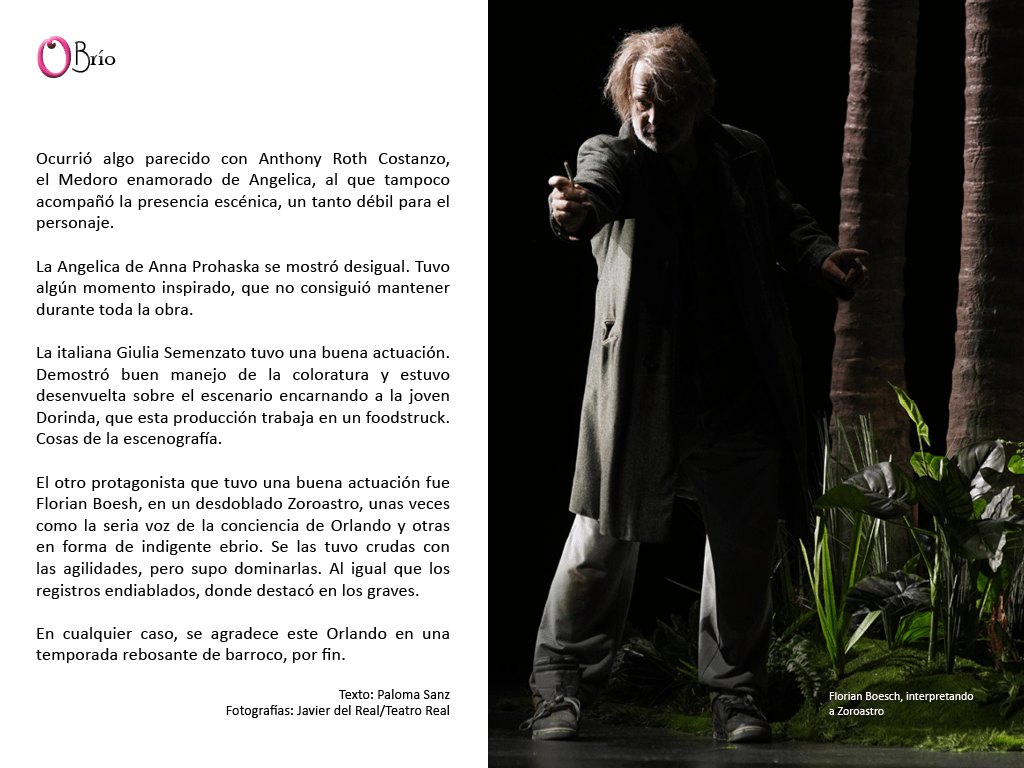 El otro protagonista que tuvo una buena actuación fue Florian Boesh, en un desdoblado Zoroastro, unas veces como la seria voz de la conciencia de Orlando y otras en forma de indigente ebrio. Se las tuvo crudas con las agilidades, pero supo dominarlas. Al igual que los registros endiablados, donde destacó en los graves.