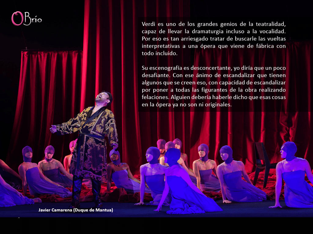 Su escenografía es desconcertante, yo diría que un poco desafiante. Con ese ánimo de escandalizar que tienen algunos que se creen eso, con capacidad de escandalizar por poner a todas las figurantes de la obra realizando felaciones. Alguien debería haberle dicho que esas cosas en la ópera ya no son ni originales.