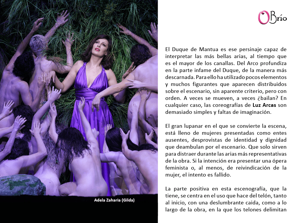 El Duque de Mantua es ese persinaje capaz de interpretar las más bellas arias, al tiempo que es el mayor de los canallas. Del Arco profundiza en la parte infame del Duque, de la manera más descarnada. Para ello ha utilizado pocos elementos y muchos figurantes que aparecen distribuidos sobre el escenario, sin aparente criterio, pero con orden. A veces se mueven, a veces ¿bailan? En cualquier caso, las coreografías de Luz Arcas son demasiado simples y faltas de imaginación.