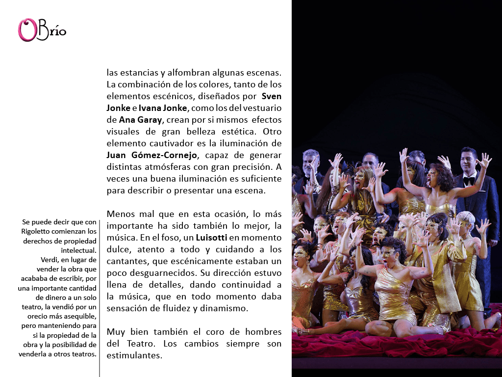 No vamos a entrar en la variedad de aristas psicológicas y filosóficas de esta gran obra y de los personajes de una ópera tan conocida. Una obra que oculta, tras la más hermosa de las partituras, una historia y una realidad que sigue siendo terrible y por la que Verdi nos sigue planteando, de manera incómoda, todo tipo de interrogantes.