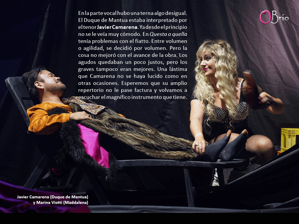 La mezzosoprano suiza Marina Viotti estuvo magnífica en el breve, pero importante papel de Maddalena. Su presencia escénica, aumentada por unas impresionantes plataformas, y su imponente voz, otorgaron carácter y personalidad a este personaje un tanto frívolo.