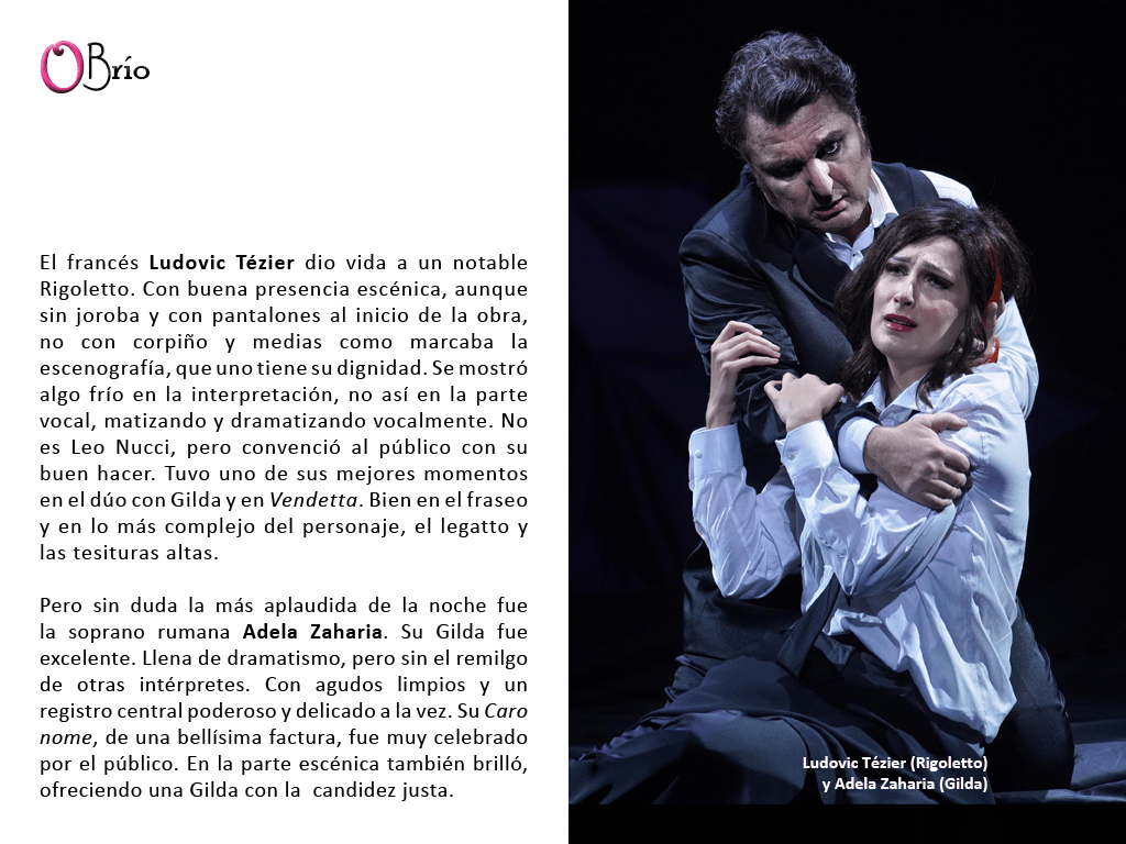 El francés Ludovic Tézier dio vida a un notable Rigoletto. Con buena presencia escénica, aunque sin joroba y con pantalones al inicio de la obra, no con corpiño y medias como marcaba la escenografía, que uno tiene su dignidad. Se mostró algo frío en la interpretación, no así en la parte vocal, matizando y dramatizando vocalmente. No es Leo Nucci, pero convenció al público con su buen hacer. Tuvo uno de sus mejores momentos en el dúo con Gilda y en Vendetta. Bien en el fraseo y en lo más complejo del personaje, el legatto y las tesituras altas.