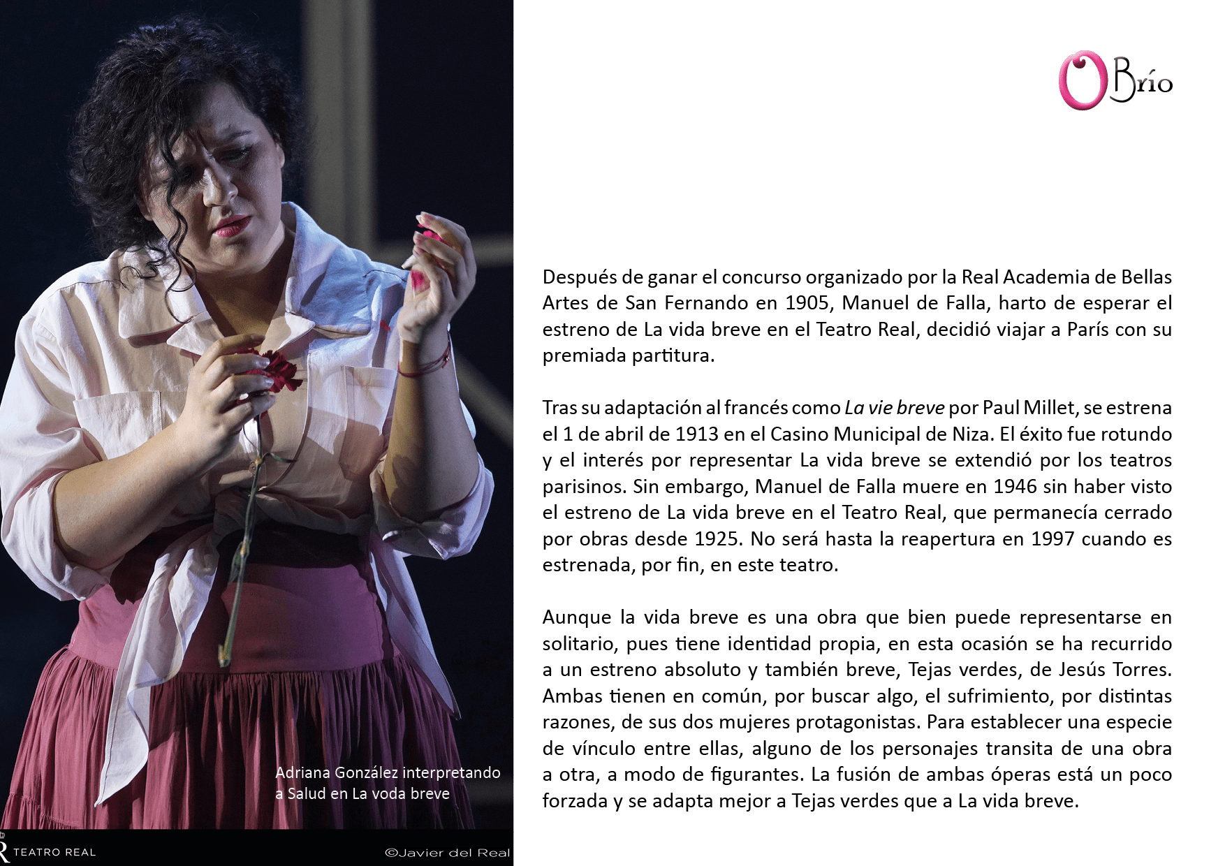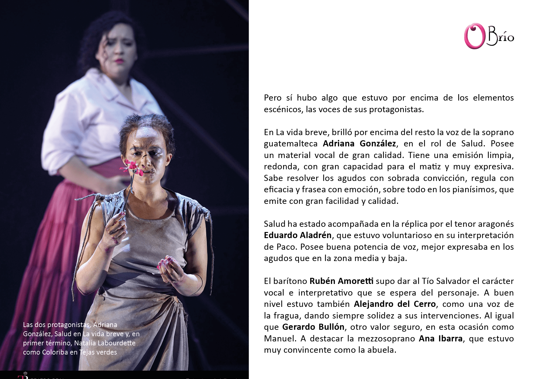 En La vida breve, brilló por encima del resto la voz de la soprano guatemalteca Adriana González, en el rol de Salud. Posee un material vocal de gran calidad. Tiene una emisión limpia, redonda, con gran capacidad para el matiz y muy expresiva. Sabe resolver los agudos con sobrada convicción, regula con eficacia y frasea con emoción, sobre todo en los pianísimos, que emite con gran facilidad y calidad.