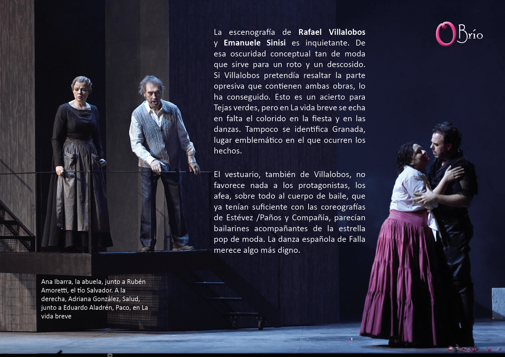 Aunque la vida breve es una obra que bien puede representarse en solitario, pues tiene identidad propia, en esta ocasión se ha recurrido a un estreno absoluto y también breve, Tejas verdes, de Jesús Torres. Ambas tienen en común, por buscar algo, el sufrimiento, por distintas razones, de sus dos mujeres protagonistas. Para establecer una especie de vínculo entre ellas, alguno de los personajes transita de una obra a otra, a modo de figurantes. La fusión de ambas óperas está un poco forzada y se adapta mejor a Tejas verdes que a La vida breve.